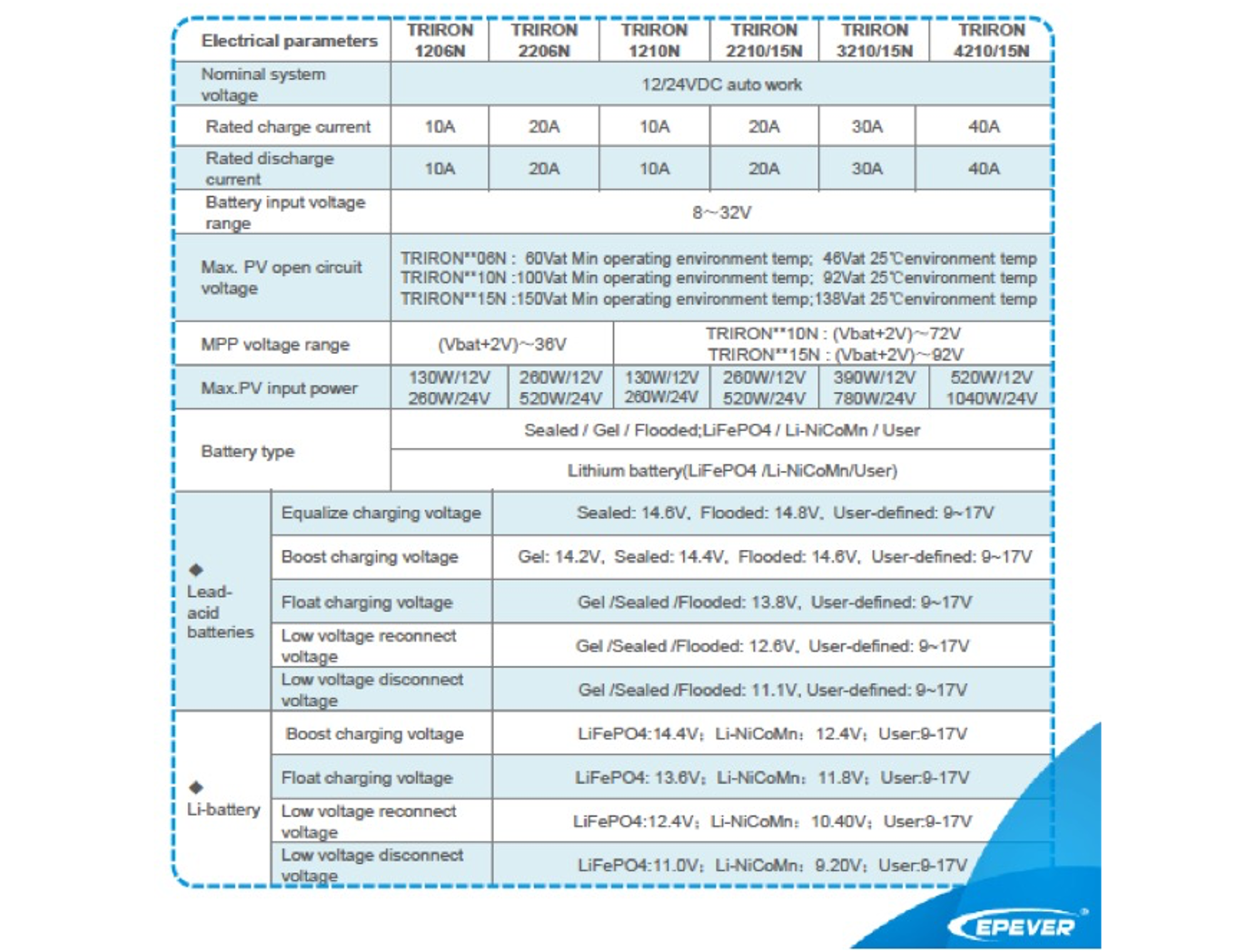 | Parameter | TRIRON 1206N (10 Amp) | TRIRON 2206N (20 Amp) | TRIRON 3210N (30 Amp) | TRIRON 4210N (40 Amp) |