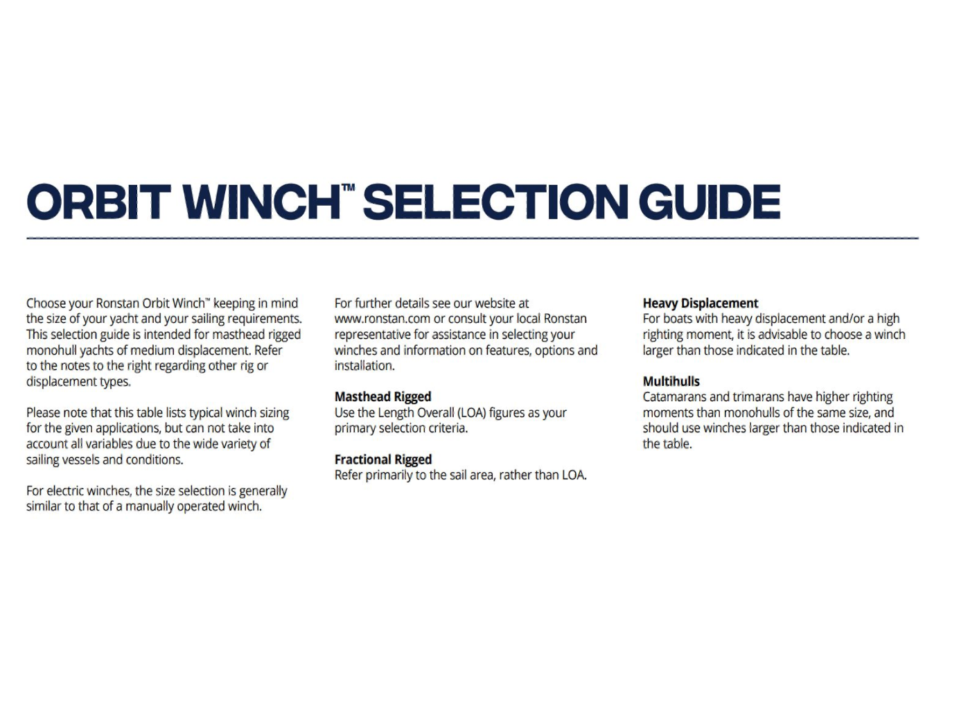 Orbit Winches™ combine fresh design thinking and proven manufacturing expertise in a performance-oriented range of lightweight aluminium winches. The new winches incorporate some of the best features of Andersen Stainless Steel Winches®, including highly efficient gearing configurations and the instantly recognisable Power Ribs™. Together, the smooth drum surface and evenly spaced Power Ribs™ provide impressive line grip and control with minimal rope wear.