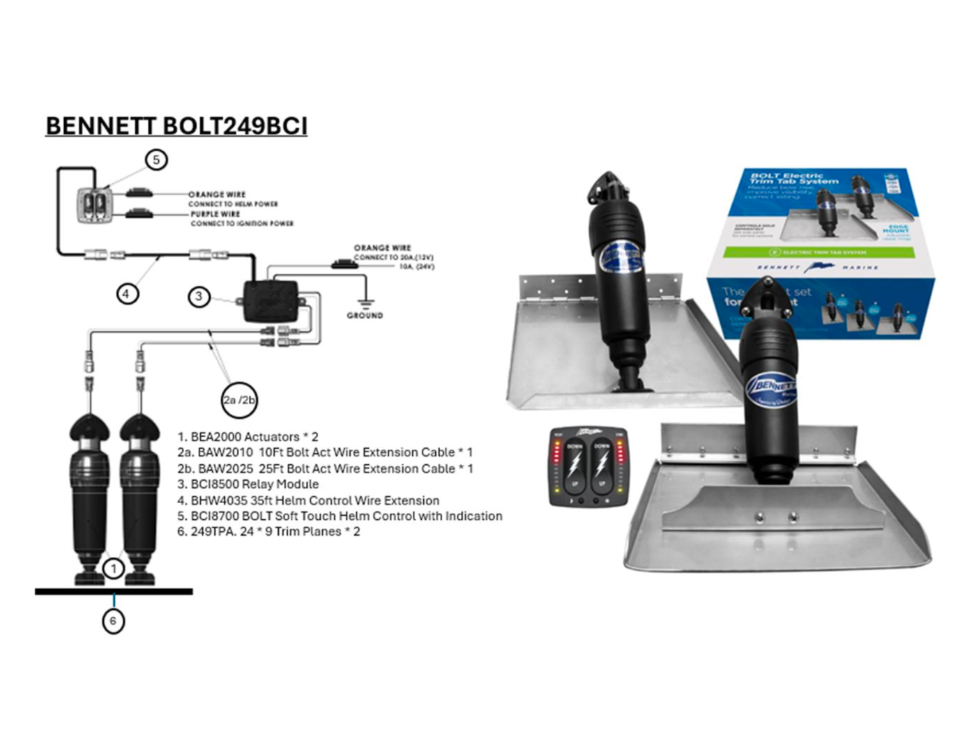 Bennett BOLT Electric Trim Tab Kits deliver power, precision and durability, allowing the skipper to get the best performance from the boat, reducing fuel consumption and improving pitching and porpoising, promoting earlier planing and reducing time in displacement mode.