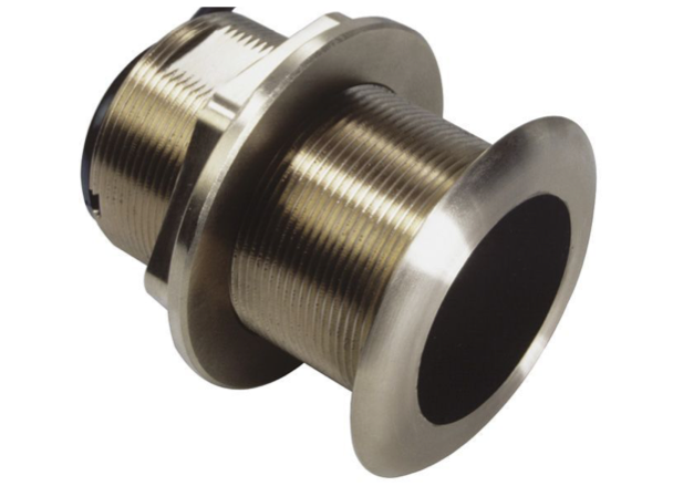 The bronze B60-12º provide a vertical beam without a fairing. Inside the housing, the ceramic element is tilted for built-in, deadrise compensation. The resulting vertical beam gives excellent echo returns for more-accurate depth readings. The nearly-flush housing minimizes drag with only 5 mm (3/16") extending outside of the hull. Sold with 2m cable.