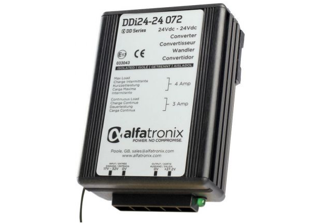 Alfatronix DDI24-24 072 Converter DC to DC Multi Selection - 24VDC to 24VDC 3A Continuous 4A Intermittent. If you need to stabilise your voltage or isolate your supply, then the DDi Series of 12V-12V and 24V-24V Isolators will suffice.The DDi Series uses modern switchmode designs and are built using the same manufacturing concepts and technologies as the successful PowerVerter range which will of course meet your 24V-12V requirements.The unit consumes an off load current of less than 100mA, which is probably less than the self discharge current of the vehicle’s battery. The unit can be mounted on uneven surfaces thanks to the ‘Click ‘n’ fit’ mounting clip which is fixed in three points. It is easy to fit the clip into awkward places, then simply click the unit into position.A red LED indicates when there is output from the converter. This gives reassurance to the installation engineer and speeds fault finding.Features:Provides a stable output voltage as well as providing galvanic isolation for a variety of application.24VDC Input24VDC Output3A Continuous 4A Intermittent72W Capacity Unit.